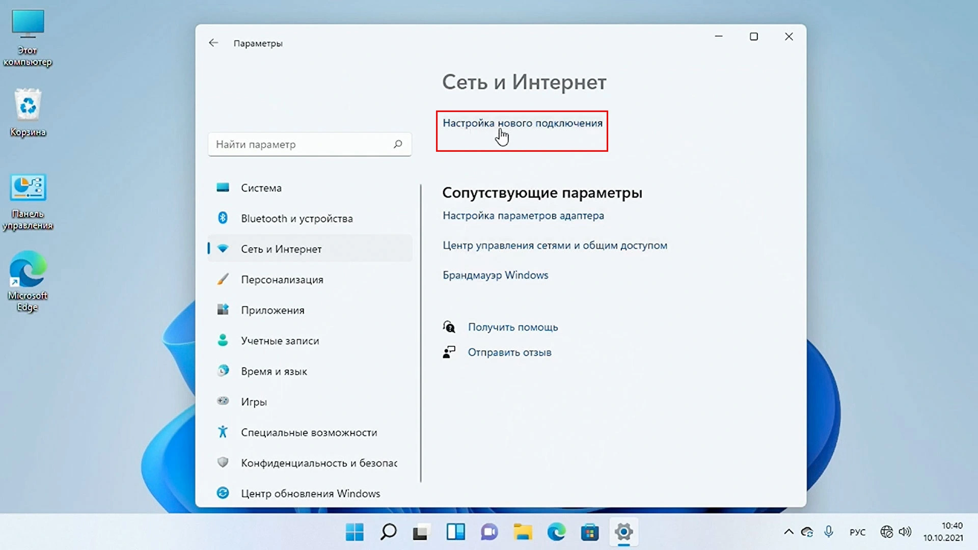 Выделите строку "Подключение к интернету / Настройка широкополосного или коммутируемого подключения к Интернету" и нажмите кнопку "Далее".