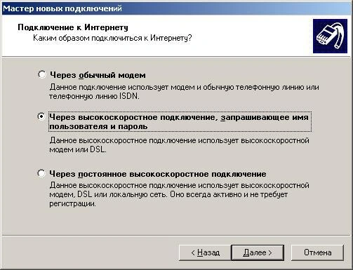 Выберите «Через высокоскоростное подключение, запрашивающее имя пользователя и пароль» и нажмите «Далее».